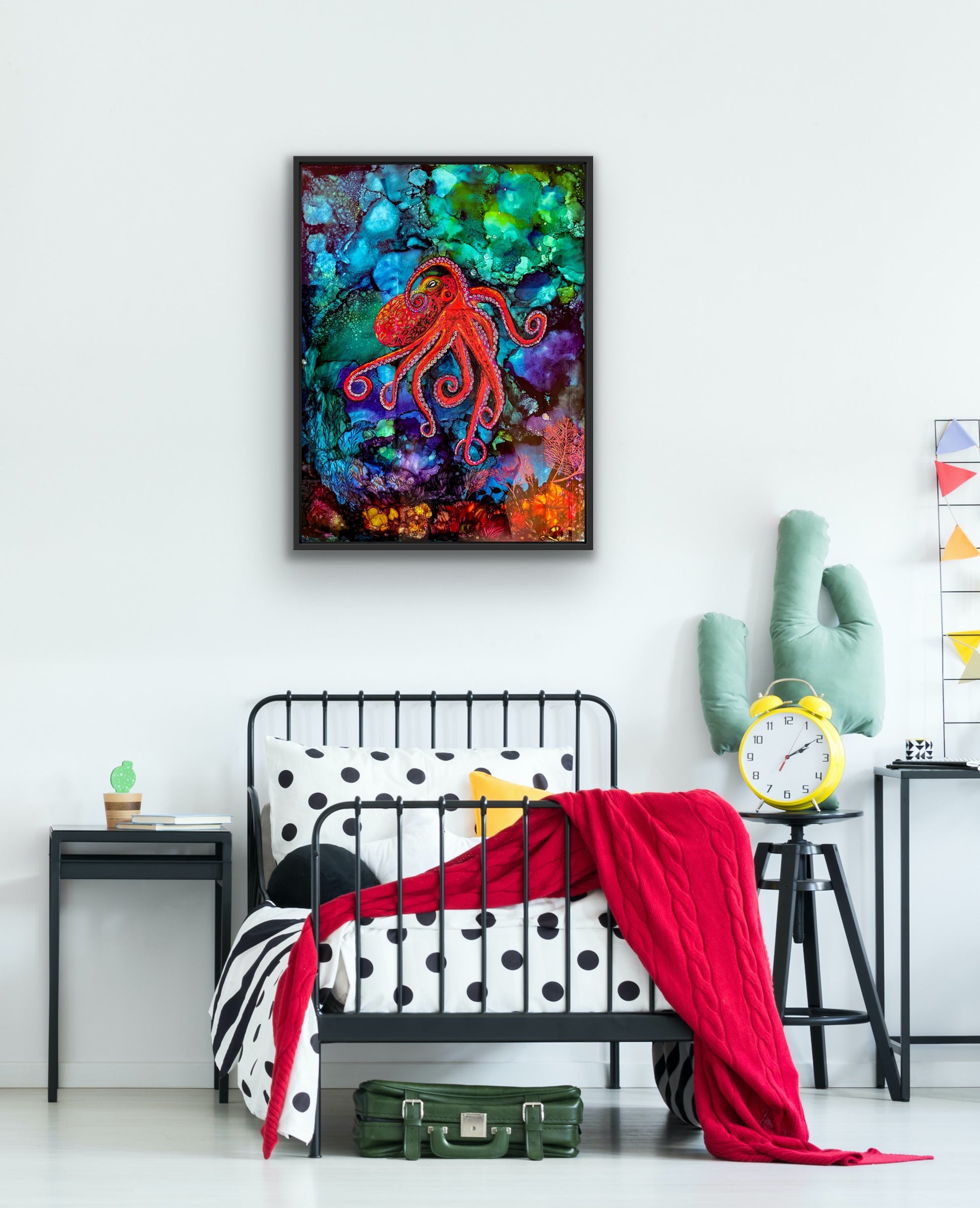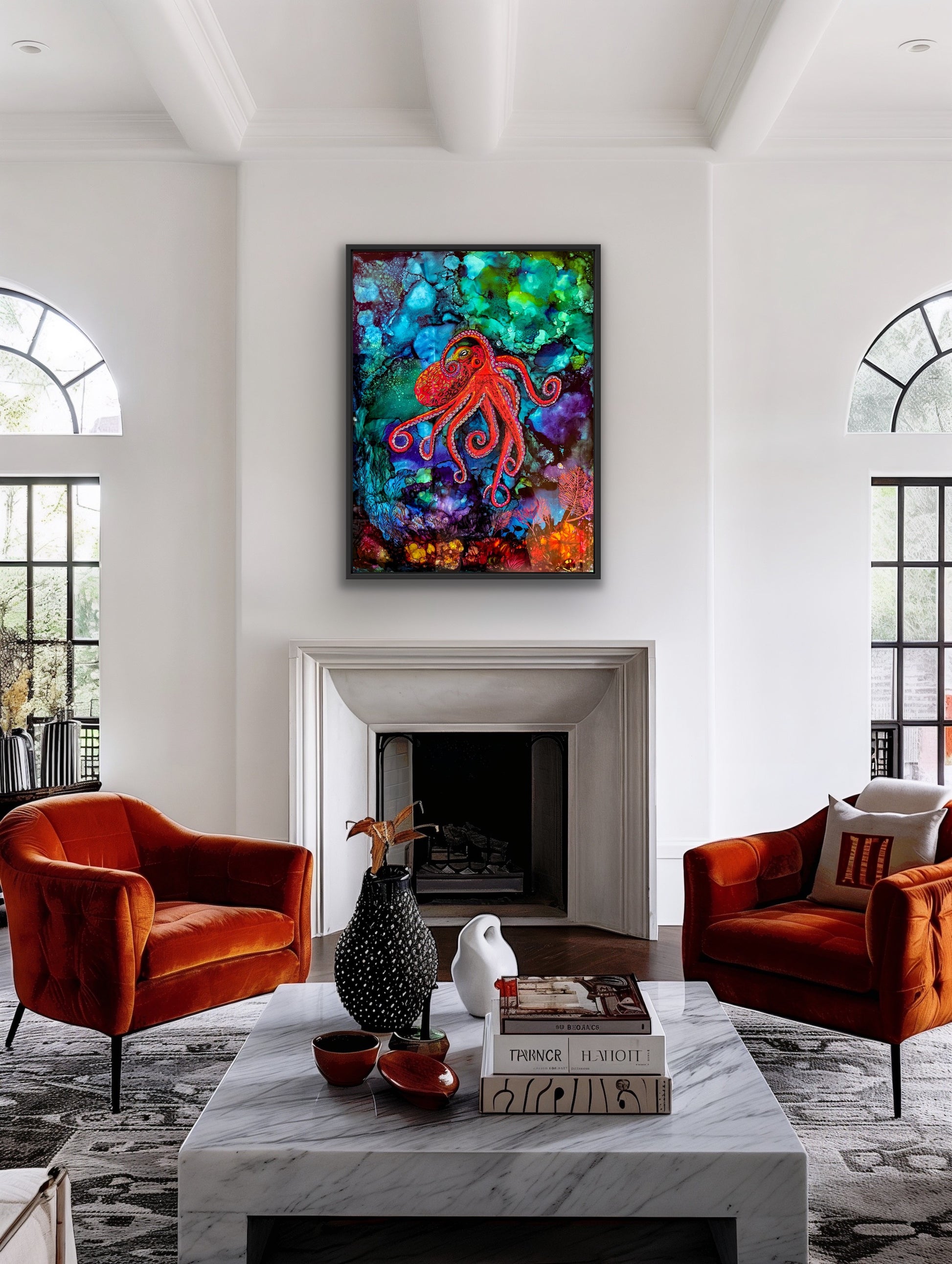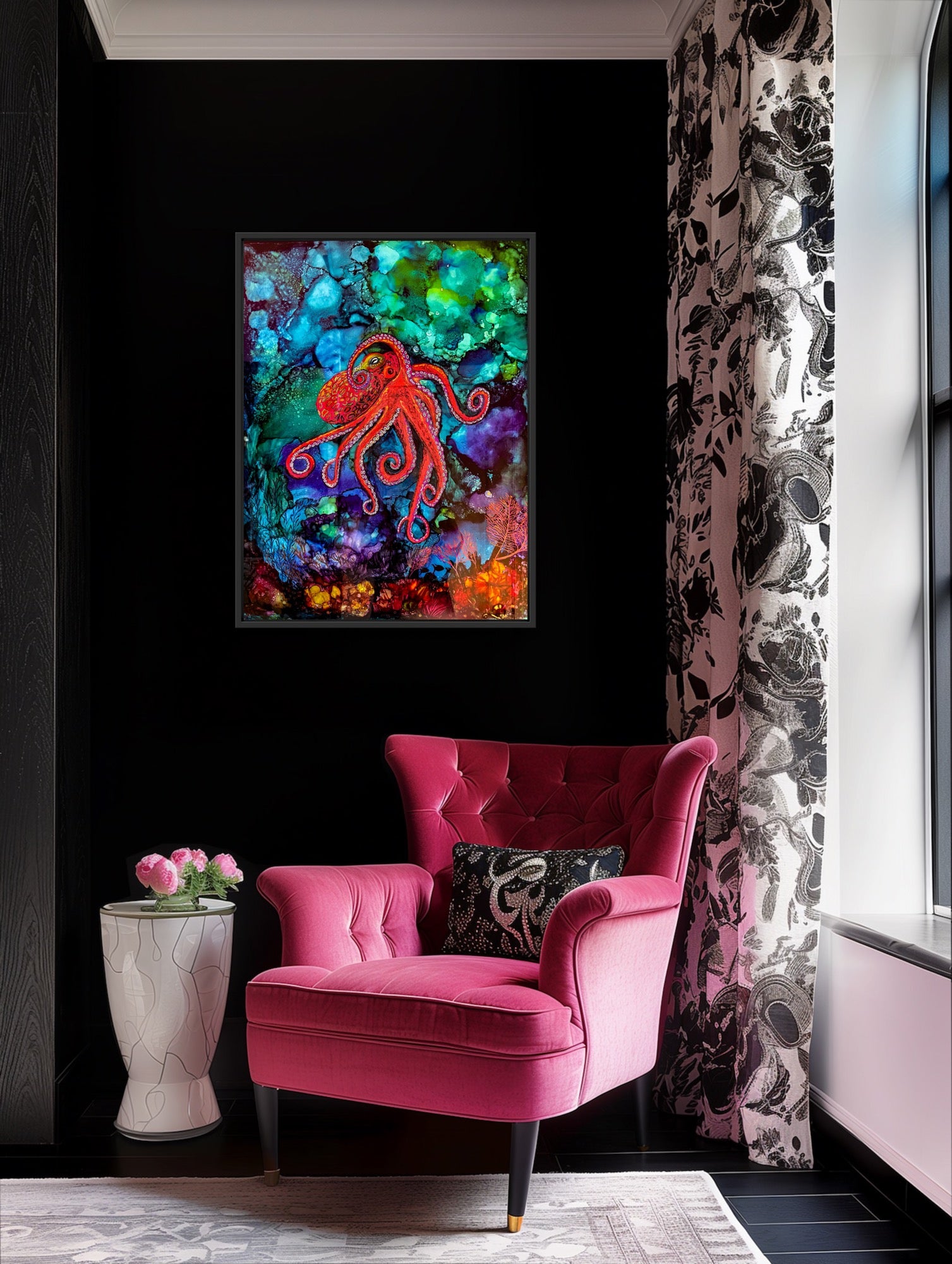 My work explores the fluid, unpredictable beauty of the undersea world through the vibrant, ethereal medium of alcohol ink. In the work Red Octopus Mother, I harness the natural movement of the ink as it spreads and pools, allowing the process itself to echo ocean currents and the glowing translucence of marine life. While traditional landscapes often present a fixed moment in time, fluid ink creates a sense of motion and luminous depth—an almost aquarium-like window into an underwater world.