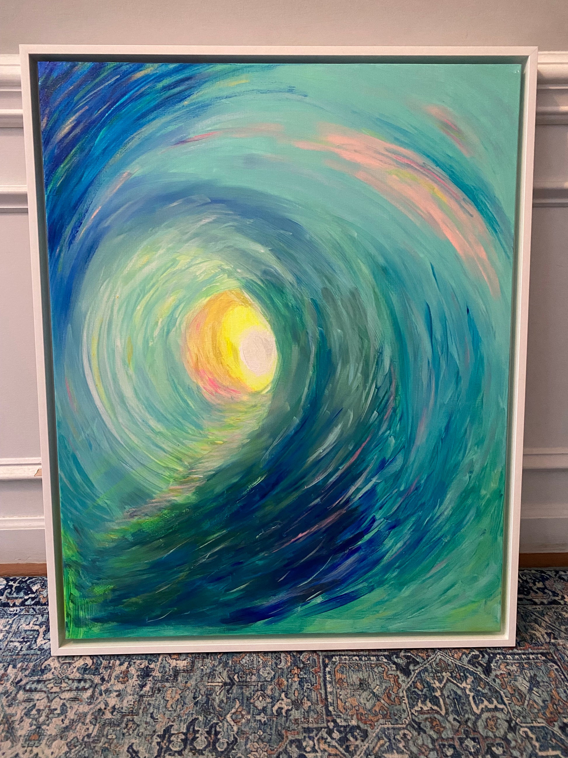 The Golden Spiral captures the radiant energy of a late afternoon wave—warm, luminous, and alive with golden iridescence. Painted in acrylic with metallic over matte tones, the work evokes the serenity of gazing through the curl of a wave, as seen by a surfer suspended in time. Yet beneath its oceanic rhythm lies a deeper reflection: the eternal pattern of the Fibonacci spiral found in nature’s design—from shells and sunflowers to galaxies. This “golden spiral of life” symbolizes harmony, balance, and the continuous unfolding of growth and self-discovery. Through its movement and light, the piece invites contemplation of how our lives, like the sea, spiral forward—ever evolving, returning, and expanding toward renewal.
